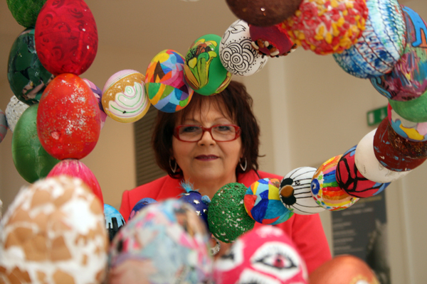 “L’uovo della collettività” è un’installazione complessa composta da quattro parti e da più di 1000 uova dipinte a mano, realizzate con la collaborazione degli studenti del Liceo artistico “Bellisario-Misticoni” di Pescara, coinvolti dall’artista in una lectio magistralis per interpretare attraverso la libera creatività e cooperazione il “senso” della sua opera presentata alla Biennale di Venezia. Tutti gli elementi riuniti nella pittoscultura rappresentano il tema della Creazione, della Rinascita e dell’Unità, pensando alla ricorrenza del centocinquantenario.